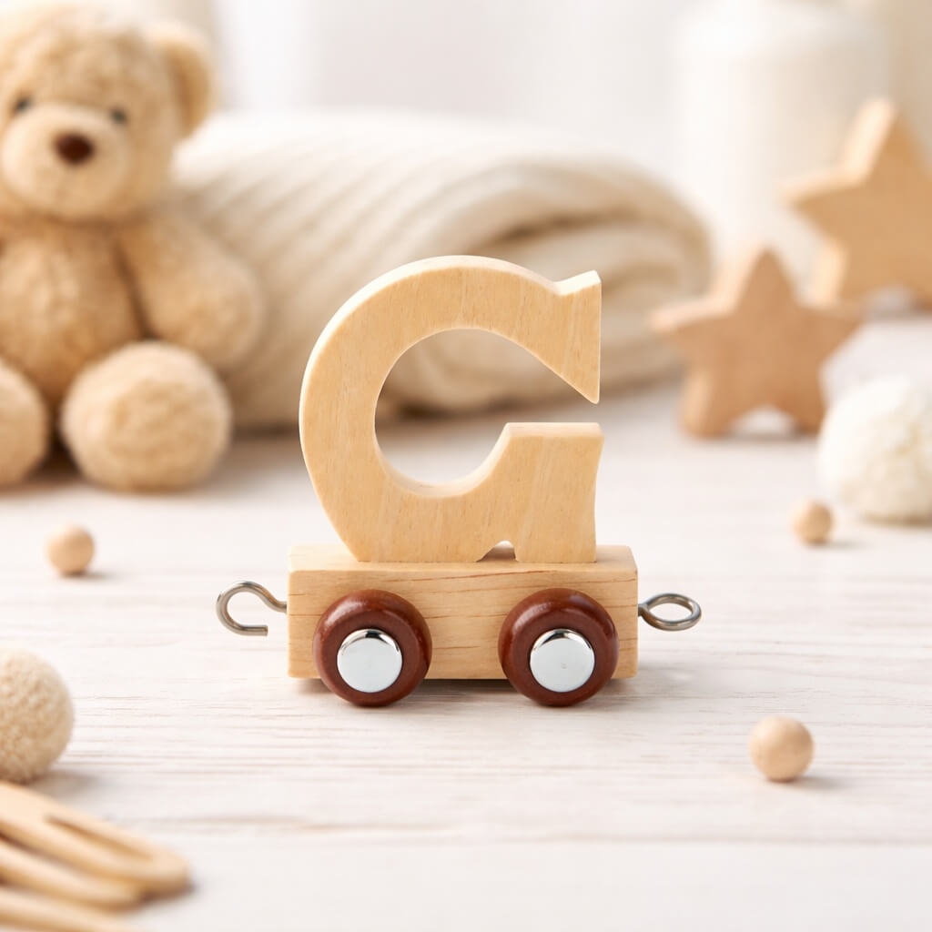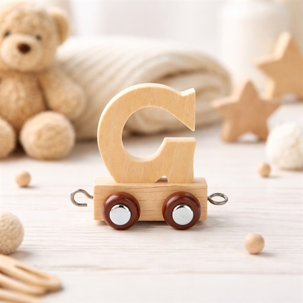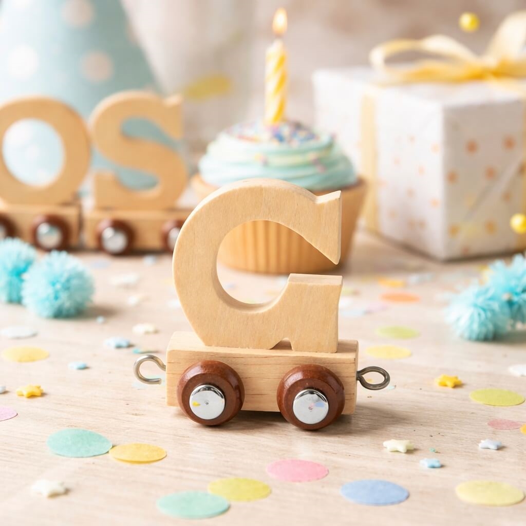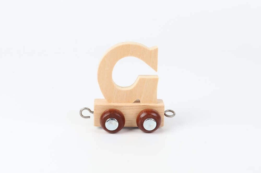 Navnetog bogstav G i naturtræ på træbord med bamse og nordisk børneværelsesindretningNavnetog bogstav G i naturtræ på festbord med cupcake, lys og pynt til børnefødselsdagNavnetog bogstav G i naturtræ monteret på togvogn som personligt trælegetøj til børneværelse