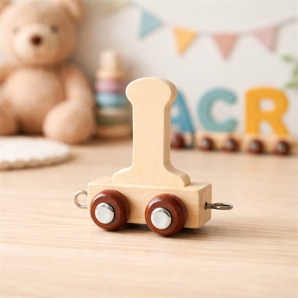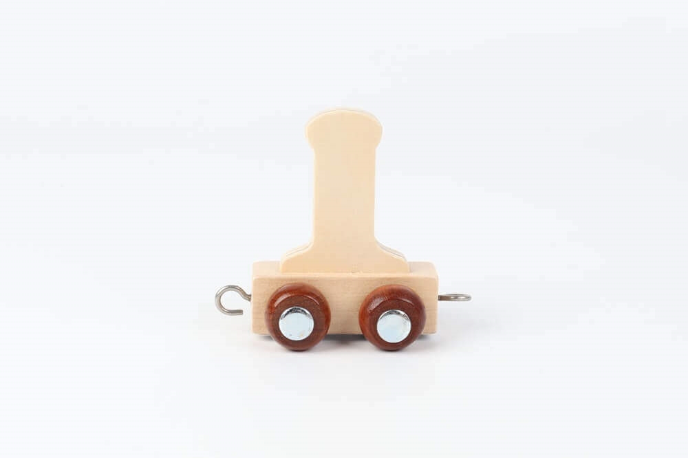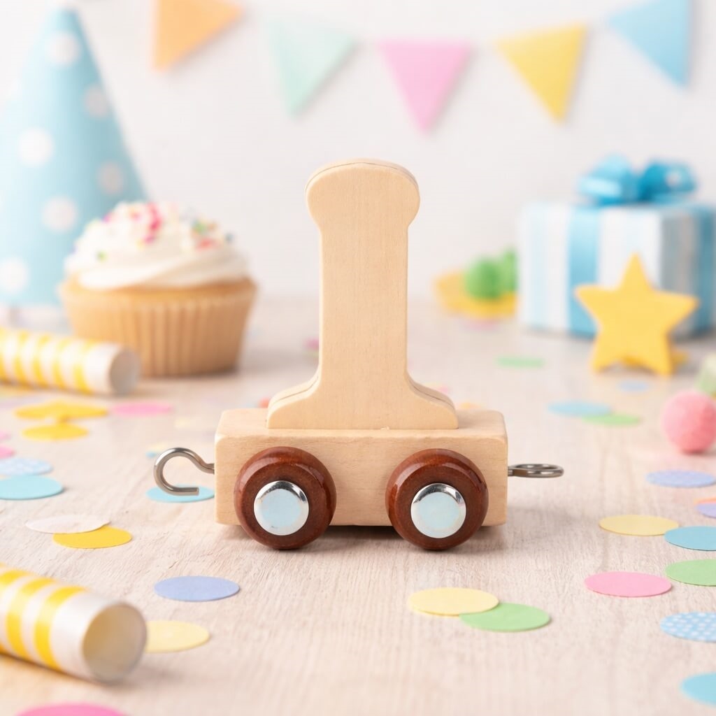 Navnetog bogstav I i naturtræ på træbord med bamse og farverige bogstavtog i baggrunden på børneværelseNavnetog bogstav I i naturtræ på bord med farverigt konfetti, cupcake og fødselsdagsdekorationer til børnefødselsdagNavnetog bogstav I i naturtræ monteret på togvogn med hjul