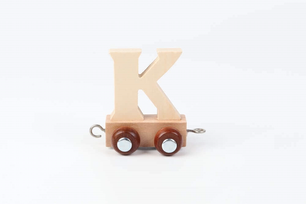 Navnetog bogstav K i naturtræ som dekoration til børnefødselsdag med farverigt trætog i baggrundenNavnetog bogstav K i naturtræ som bordpynt til børnefødselsdag med kage, balloner og gaver i baggrundenNavnetog bogstav K i naturtræ på hvid baggrund – træbogstav på hjul til personligt navnetog
