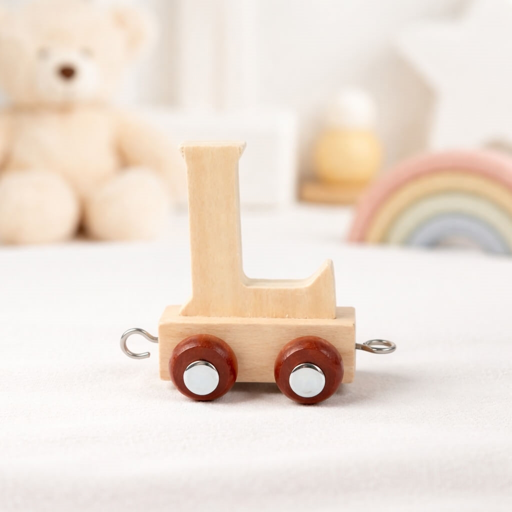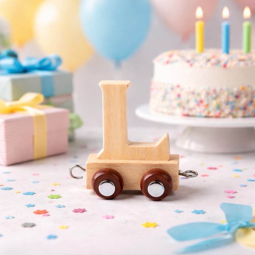 Træ navnetog bogstav L i natur på børneværelse med blød baggrund og legetøjNavnetog bogstav L i naturtræ på bord til børnefødselsdag med kage og gaver i baggrundenNavnetog bogstav L i naturtræ med hjul som del af personligt navnetog til børneværelse