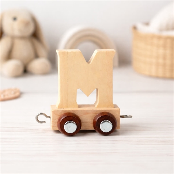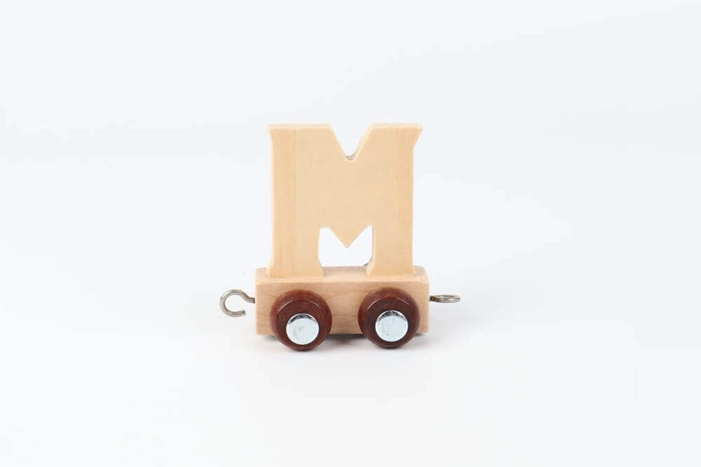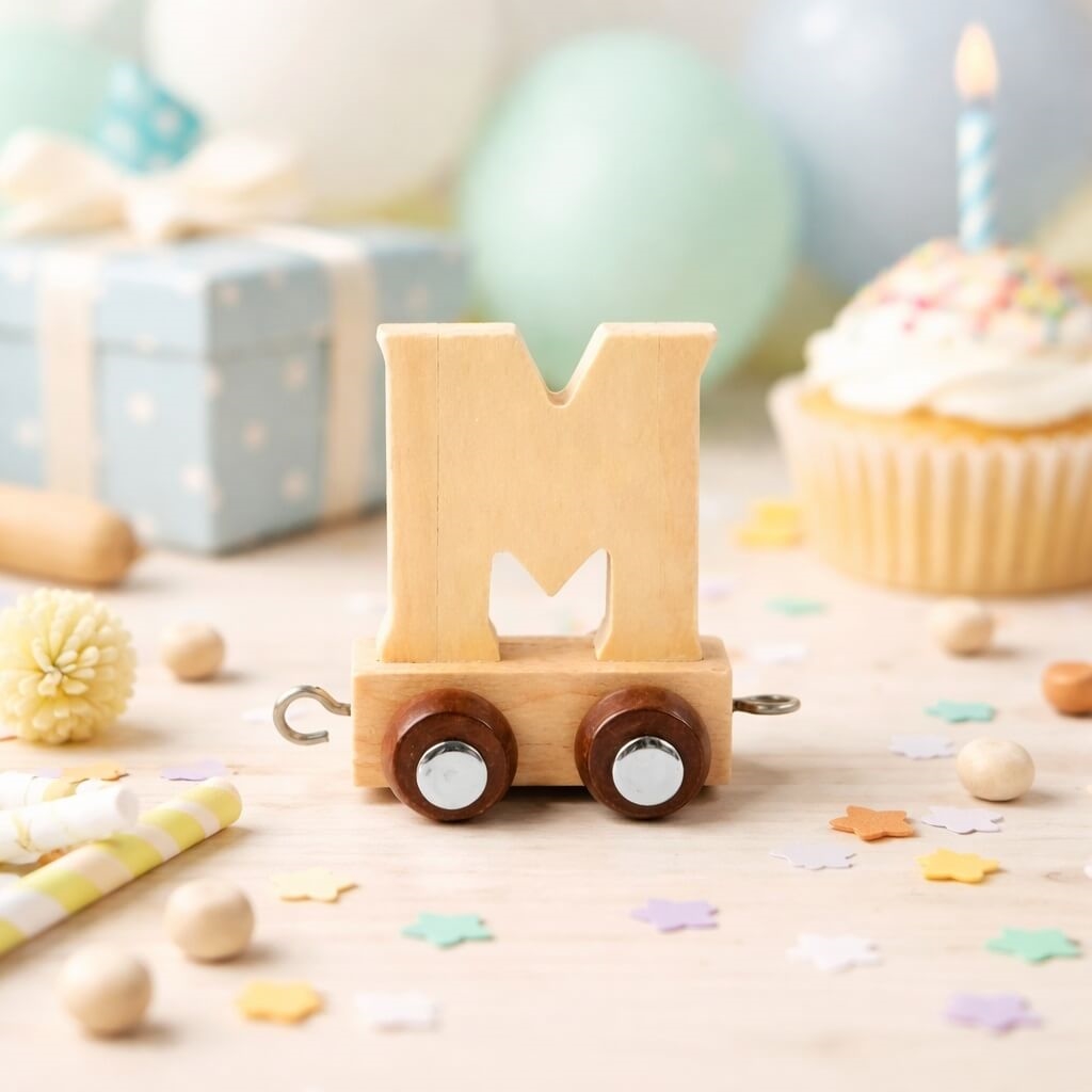 Navnetog bogstav M i naturtræ på togvogn placeret på lyst bord i hyggeligt børneværelseNavnetog bogstav M i naturtræ på togvogn omgivet af pynt til børnefødselsdagNavnetog bogstav M i naturtræ monteret på lille togvogn til personlig dekoration på børneværelse