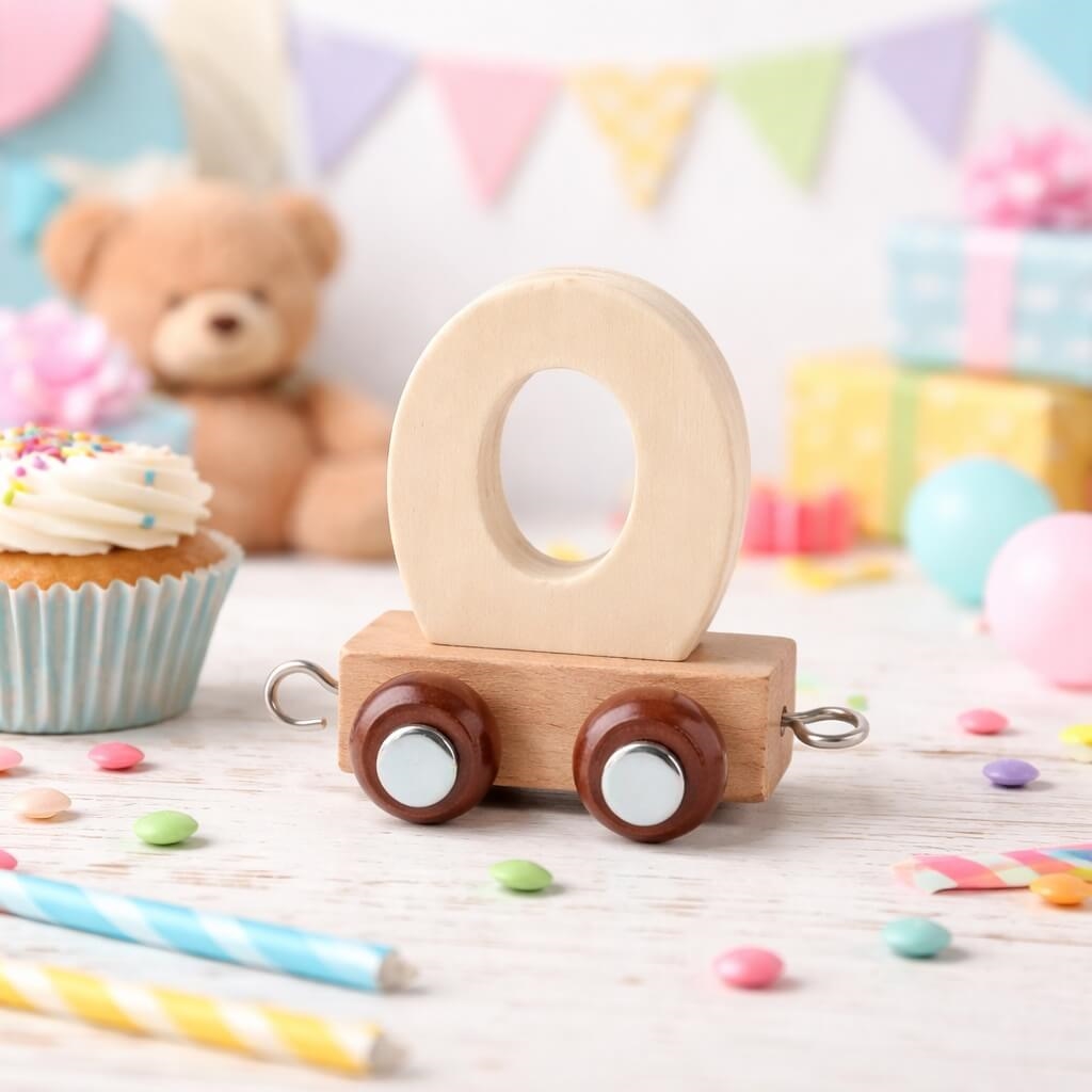 Navnetog bogstav O i naturtræ på togvogn placeret på gulv i hyggeligt børneværelseNavnetog bogstav O i naturtræ på togvogn omgivet af farverig pynt til børnefødselsdagNavnetog bogstav O i naturtræ med hjul og magnetkoblinger til personligt navnetog i træ