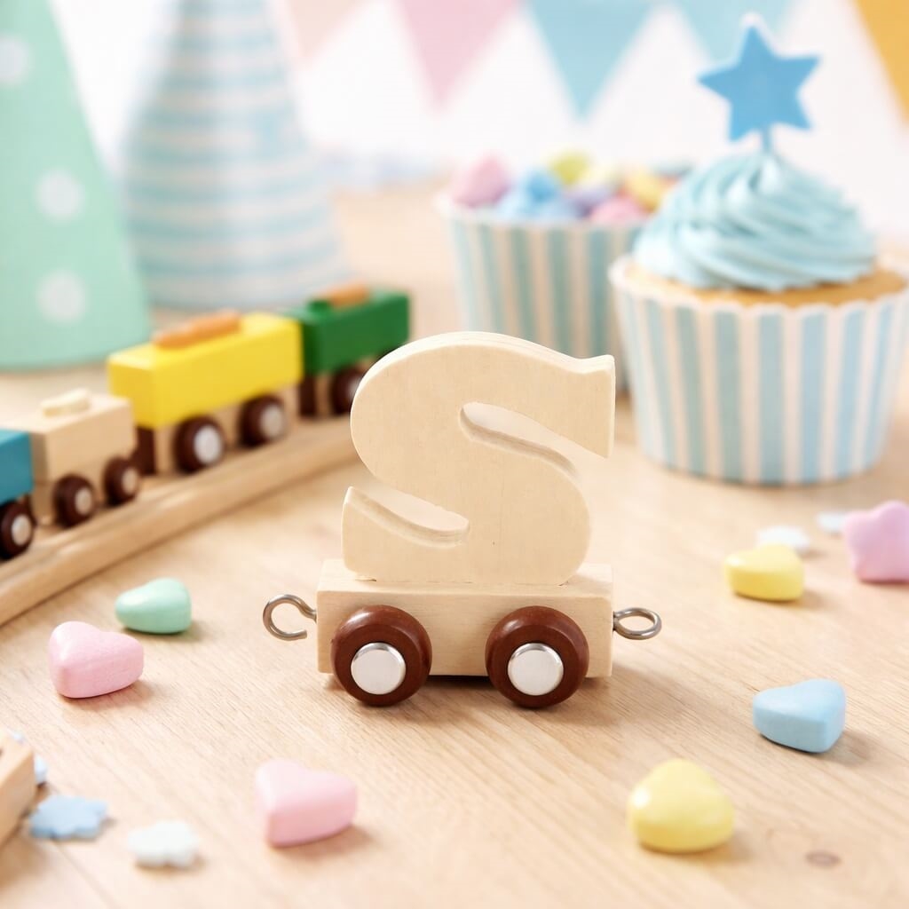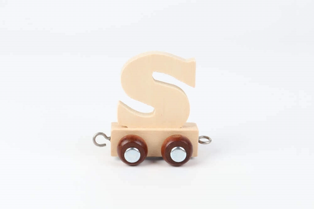 Navnetog bogstav S i naturtræ som trælegetøj på bord med bamse, regnbue og pastelfarvet pynt på børneværelseNavnetog bogstav S i naturtræ som trælegetøj på bord med cupcakes og pynt til børnefødselsdagNavnetog bogstav S i naturtræ som træ togvogn med hjul på hvid baggrund