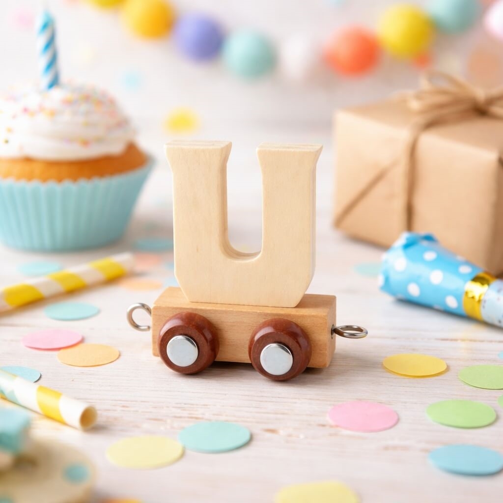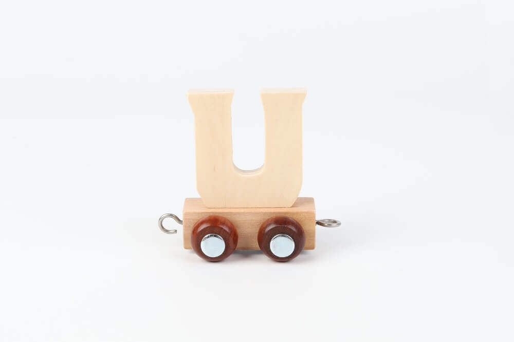 Navnetog bogstav U i naturtræ på togvogn dekoreret på hyggeligt børneværelseNavnetog bogstav U i naturtræ på togvogn omgivet af farverig pynt til børnefødselsdagNavnetog bogstav U i naturtræ monteret på togvogn med hjul