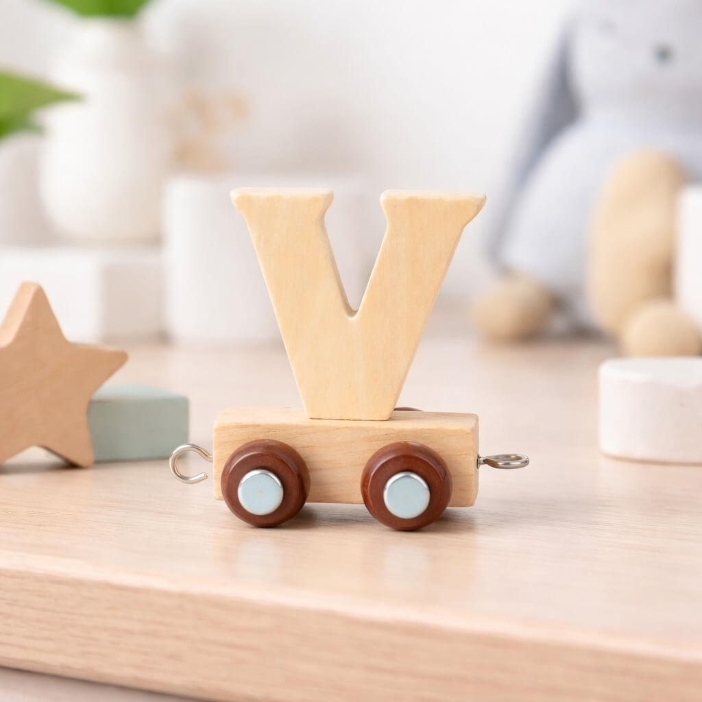Navnetog bogstav V i natur er en del af en populær serie af træbogstaver, der gør det muligt at stave barnets navn på en dekorativ og legende måde. Hvert bogstav er udformet som en togvogn, der nemt kan kobles sammen med andre bogstaver og figurer i serien.
