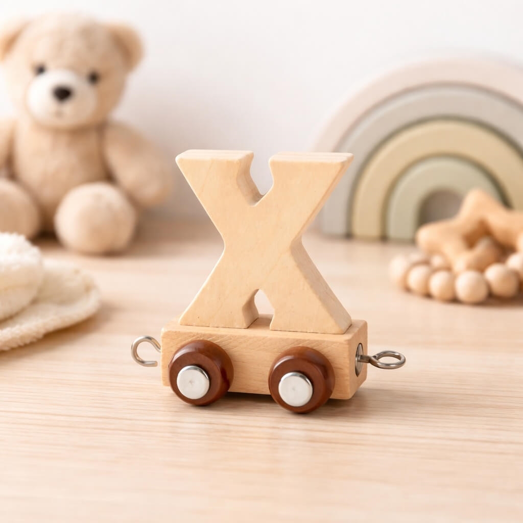 Navnetog bogstav X i naturtræ på træbord med bamse og regnbuelegetøj i baggrunden på børneværelseNavnetog bogstav X i naturtræ på bord til børnefødselsdag med cupcake, gave og farverig pynt i baggrundenNavnetog bogstav X i naturtræ på hjul med magnetkoblinger isoleret på hvid baggrund