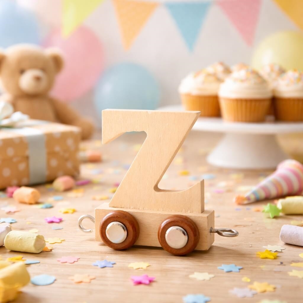Navnetog bogstav Z i naturtræ som dekorativ trævogn på børneværelse med bamse og legetøj i baggrundenNavnetog bogstav Z i naturtræ på fødselsdagsbord med konfetti, cupcakes og børnepyntNavnetog bogstav Z i naturtræ som træbogstav på hjul til personligt navnetog til børn