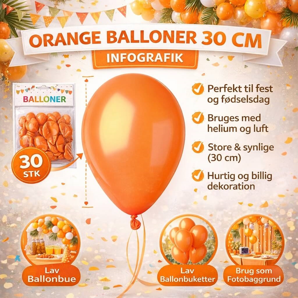 Orange ballon 30 cm latex til fest, fødselsdag og dekorationOrange balloner 30 cm 50 stk – latex balloner til fest, fødselsdag og dekorationOrange balloner 30 cm til fest dekoration – stemningsbillede med ballonbuket og festbordKvinde pynter med orange balloner 30 cm i ballonguirlande til fest og fødselsdag udendørsInfografik med orange balloner 30 cm – fest dekoration, ballonbue, ballonbuketter og fotobaggrundClose-up af orange ballon 30 cm hvor knuden bindes – latex ballon til fest og dekoration