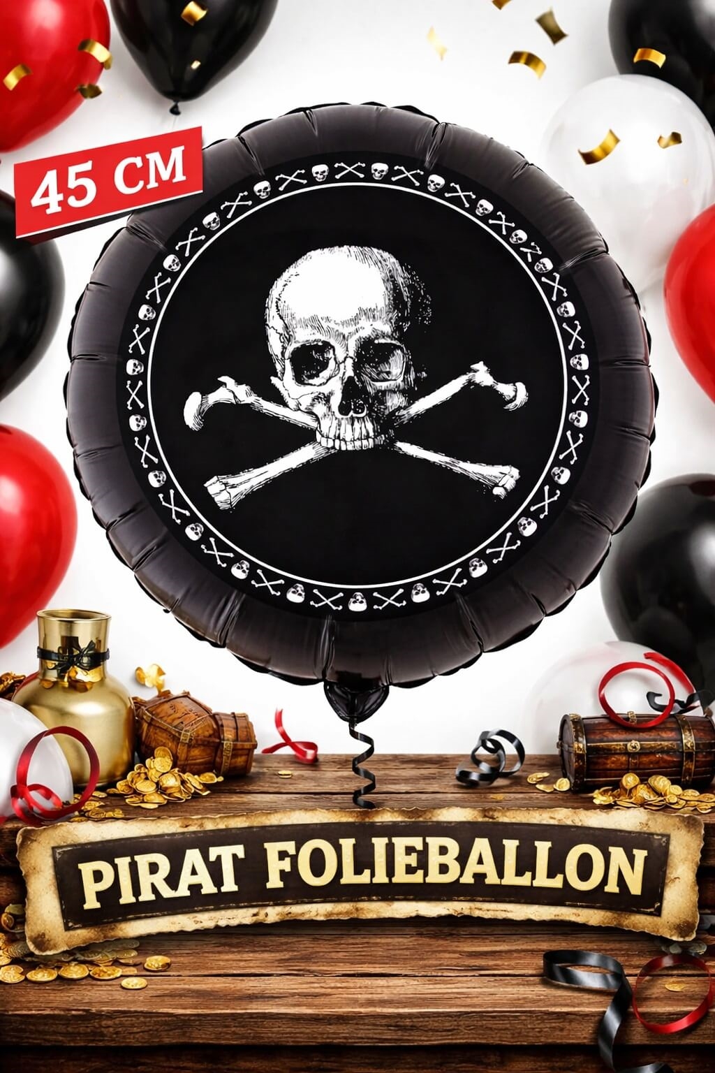 Pirat folieballon 45 cm sort med dødningehoved til pirat fødselsdag og festpyntPirat folieballon 45 cm til børnefødselsdag med pirat tema borddækning og festpyntPirat folieballon 45 cm brugt til børnefødselsdag med pirat tema, kage, borddækning og festpyntPirat folieballon 45 cm med dødningehoved motiv – perfekt til pirat fødselsdag og temafest, kan fyldes med helium eller luft