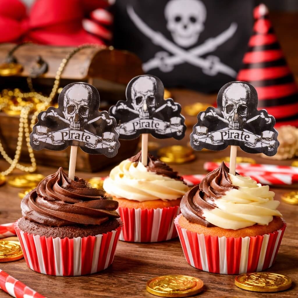 Pirat kagepynt 24 stk i emballage med cocktail sticks og dødningehoved cupcake toppersPirat cupcakes med pirat kagepynt til børnefødselsdag med pirat tema og fest dekorationPirat kagepynt 24 stk brugt på chokoladekage til børnefødselsdag med pirat temaClose-up af pirat kagepynt med dødningehoved på cupcake til pirat børnefødselsdagInfografik med pirat kagepynt 24 stk til cupcakes og børnefødselsdag med pirat tema