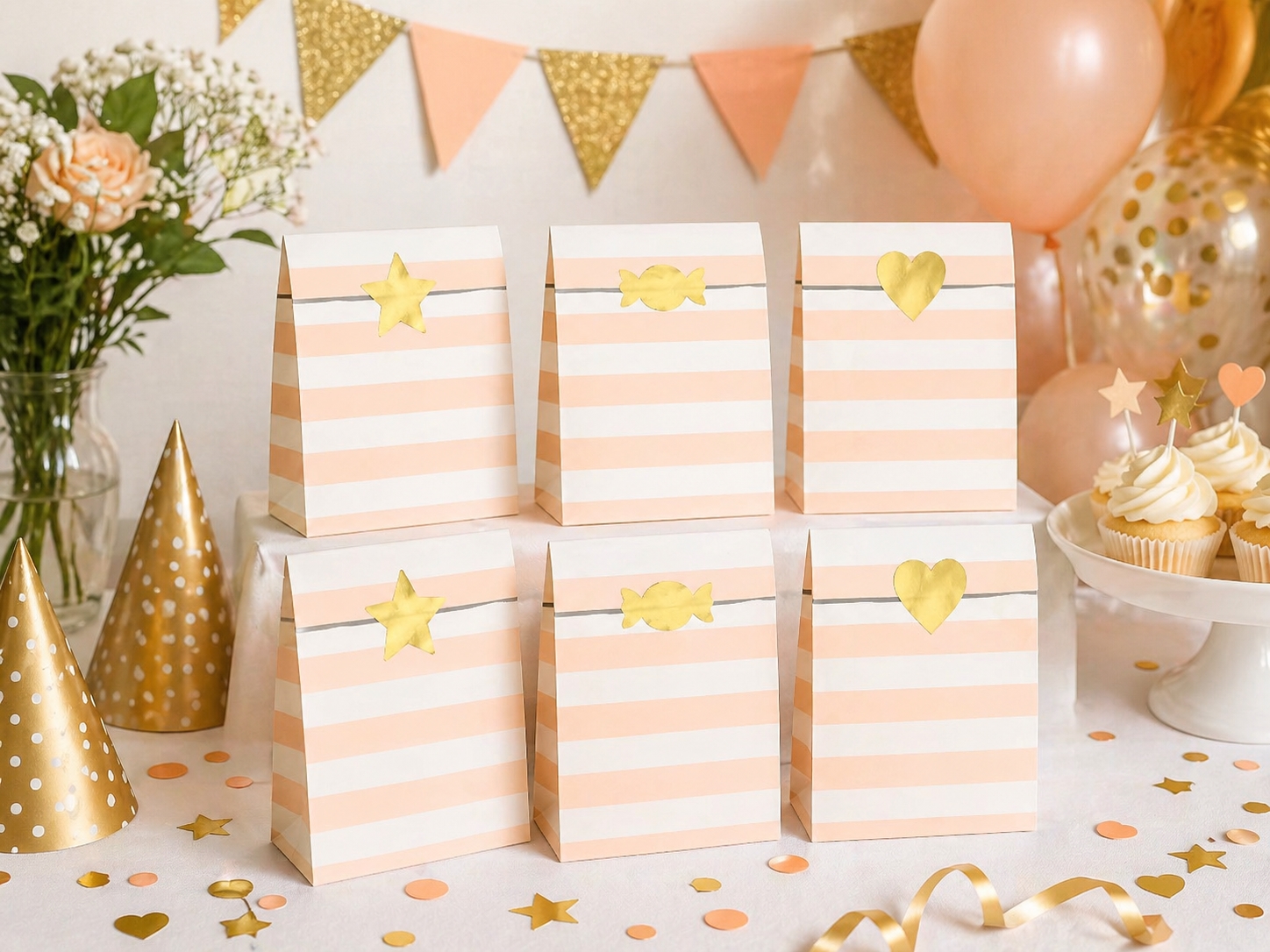 Hold en hyggelig barnedåb eller en sjov fødselsdagsfest for din datter med en slikbuffet. I slikbuffeten skal der være slikposer med slik i. Og til en lille pige vil disse søde, lyserøde og hvide poser med guldfarvede stickers være perfekte.