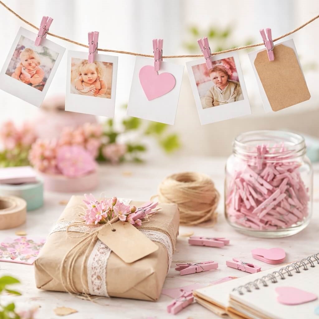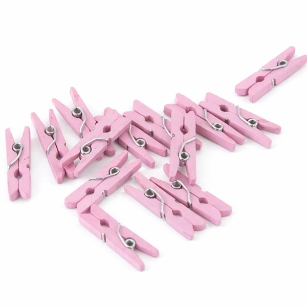 Små rosa træklemmer i træ 3,5 cm – 24 stk til pynt og dekorationSmå rosa træklemmer brugt som pynt til babyshower med kort, gave og lyserød festdekorationSmå rosa træklemmer brugt til kreativ dekoration med fotos, gaveindpakning og DIY pyntRosa træklemmer brugt som pynt til pigebarnedåb med kort, gave og dekoration i lyserøde nuancer