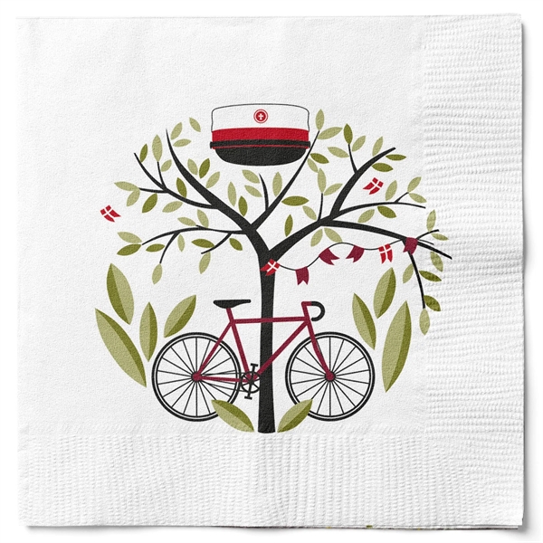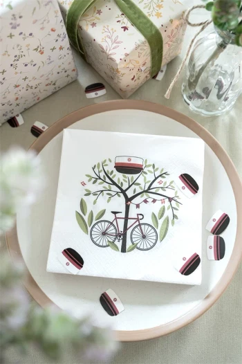 Denne flotte studenterserviet med cykel og studenterhue er det perfekte valg til en stilfuld og gennemført studenterfest. Det smukke motiv med rød cykel, studenterhue og danske flag skaber en hyggelig og autentisk dansk stemning.