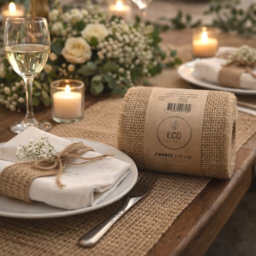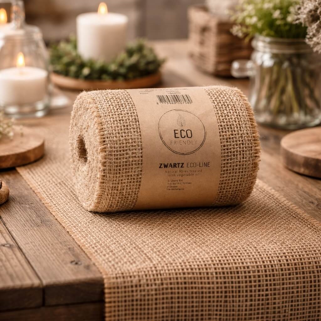 Sizo jute bordløber i natur brugt til rustik borddækning med stearinlys og blomster på træbordJute bordløber på festbord med servietter, stearinlys og blomster i naturlig borddækningSizo jute bånd bordløber i natur 15 cm x 10 m – naturlig og rustik borddekoration i juteSizo jute bånd bordløber i natur brugt til kreativ DIY dekoration med gaveindpakning, blomster og rustik bordpynt