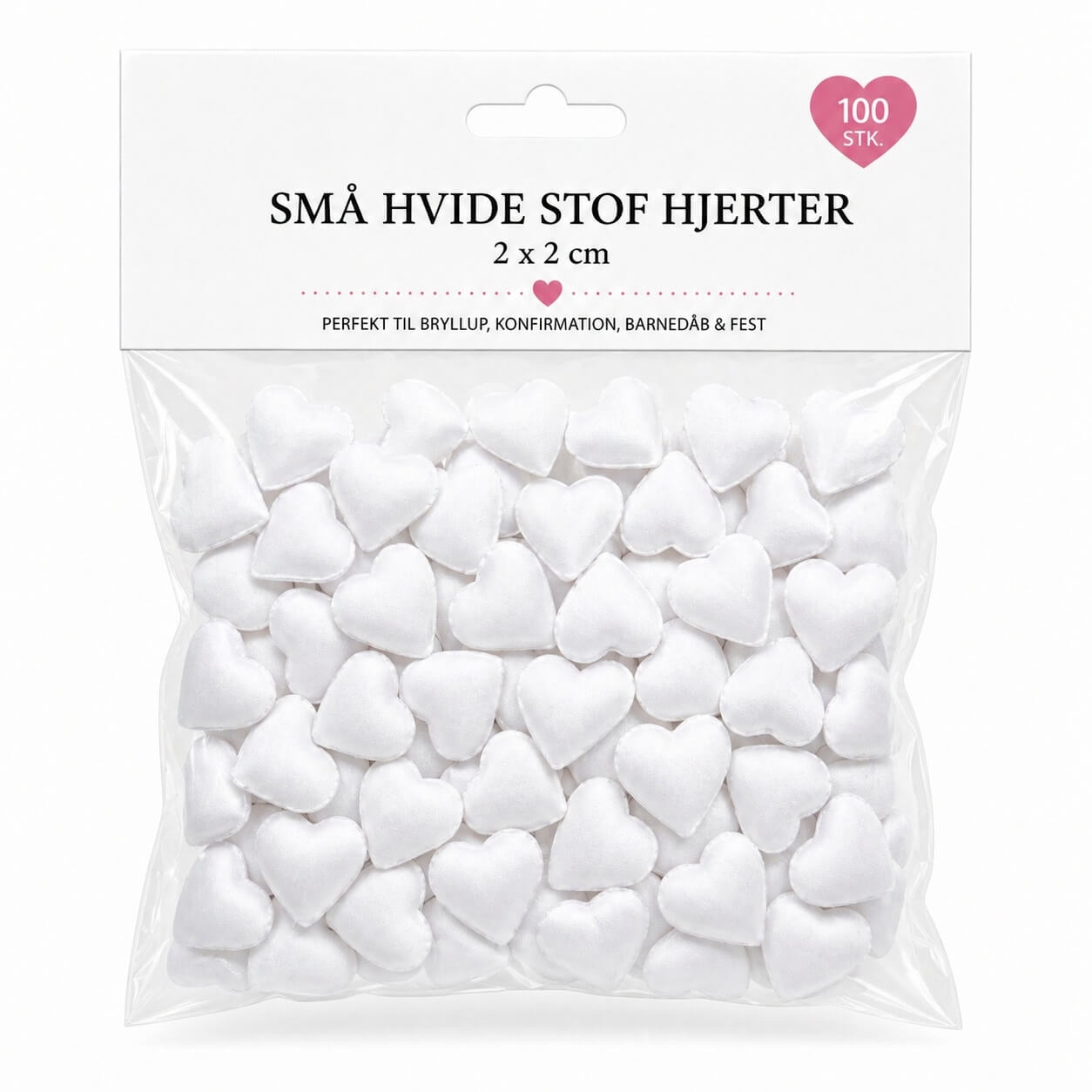 Der er 100 stk. hvide stofhjerter i posen.