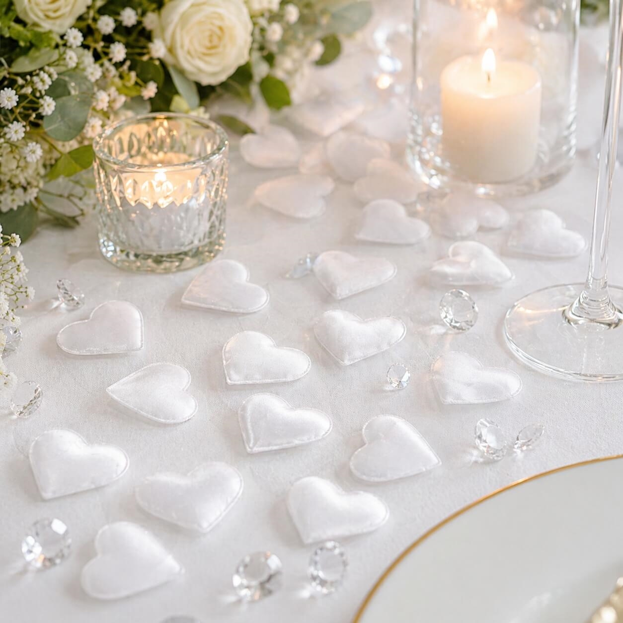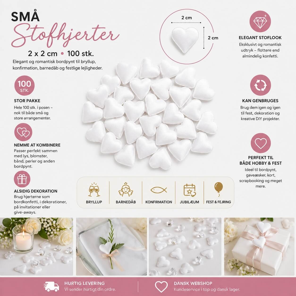 Skab en elegant og romantisk stemning med disse små hvide stofhjerter i størrelse 2x2 cm. De smukke stofhjerter er perfekte som bordpynt til bryllup, konfirmation, barnedåb, valentinsdag og andre festlige begivenheder, hvor detaljerne gør forskellen.