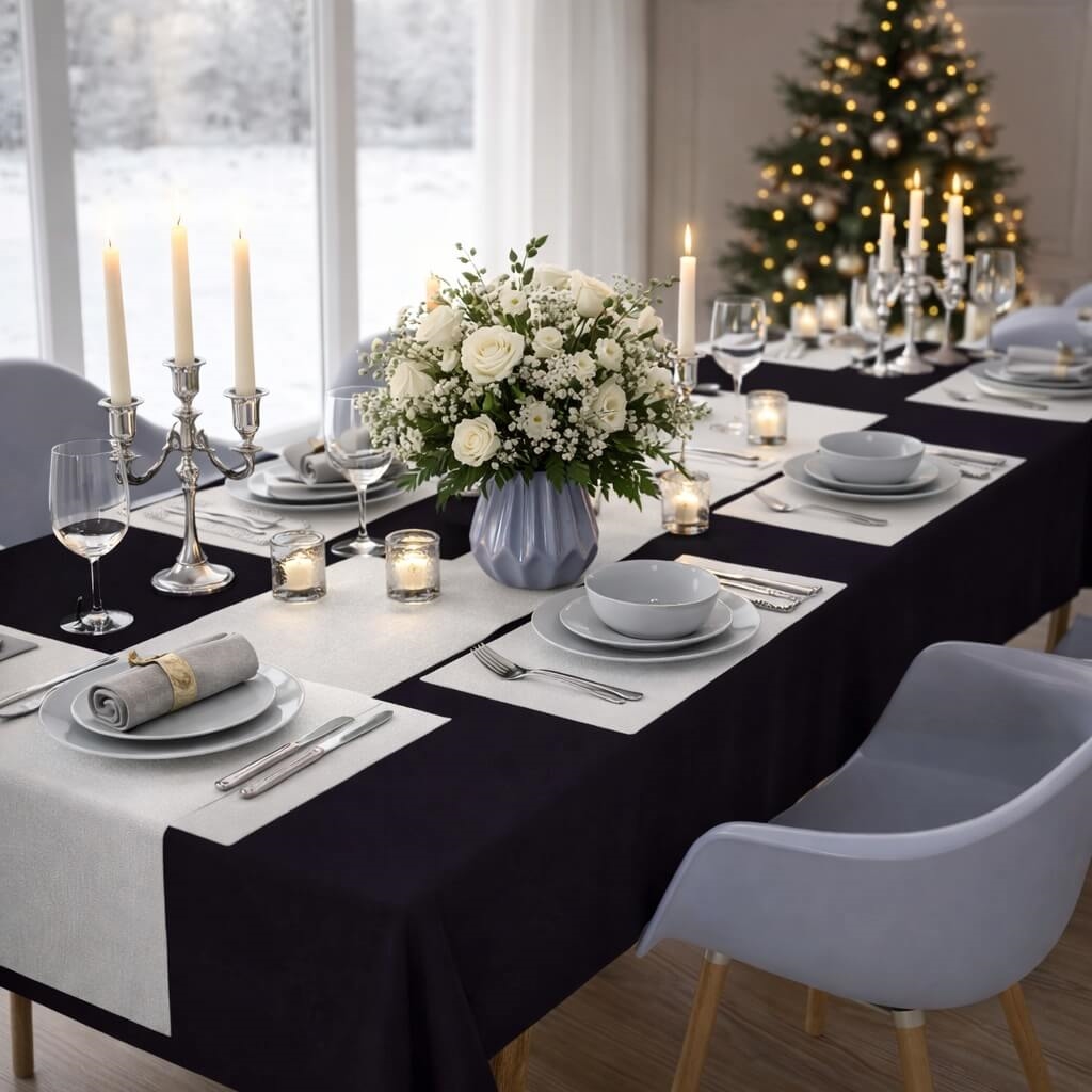 Elegant pyntet festbord med sort Sovie Airlaid papirdug og lys bordløber, dækket med service, stearinlysElegant pyntet festbord med sort Sovie Airlaid papirdug og hvid bordløber, dækket med service i moderne festlokale.Elegant pyntet festbord med sort Sovie Airlaid papirdug og lys bordløber, dækket med service, stearinlys og blomster i lyst festlokale.