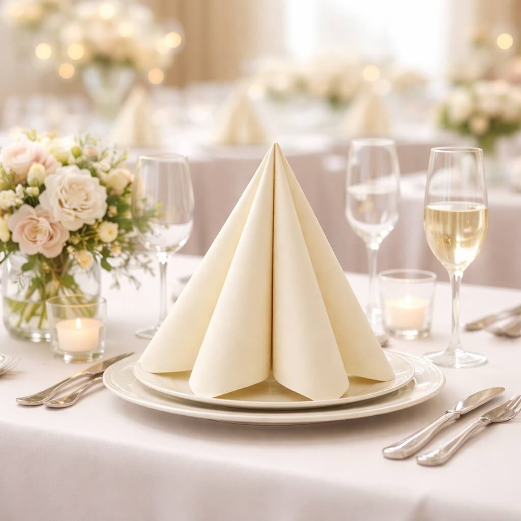 Sovie Linclass Airlaid serviet i creme farve foldet i pyramdeform på hvid baggrund, 40x40 cmElegant opdækket festbord med Sovie Linclass Airlaid serviet i creme foldet i pyramdeform på tallerken, omgivet af blomster, glas og stearinlys.Elegant opdækket festbord med Sovie Linclass Airlaid servietter i creme, blomsterdekorationer, vinglas og stearinlys i lyst festlokale.Sovie Linclass Airlaid serviet i creme foldet elegant på tallerken på pyntet festbord med blomster, stearinlys og vinglas.