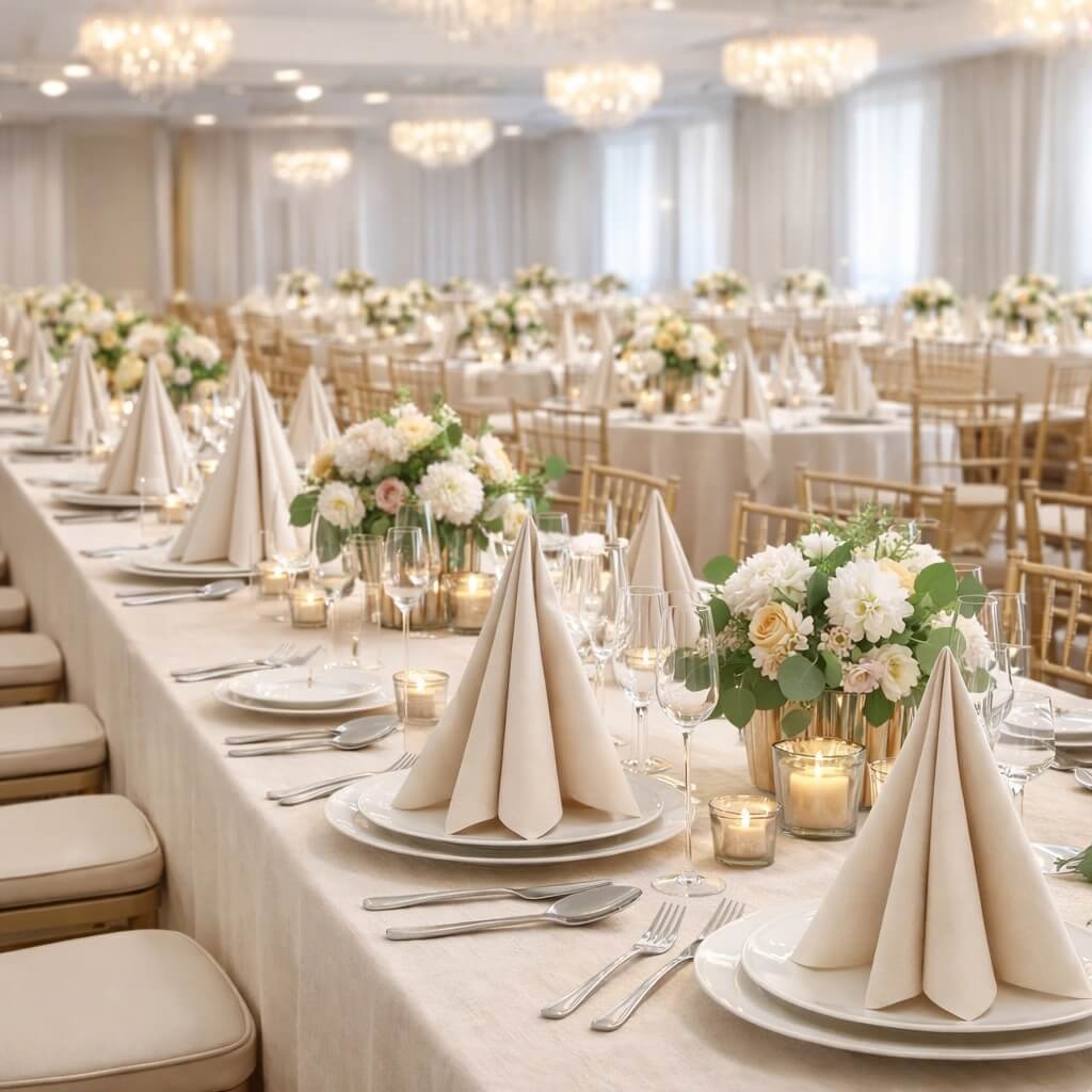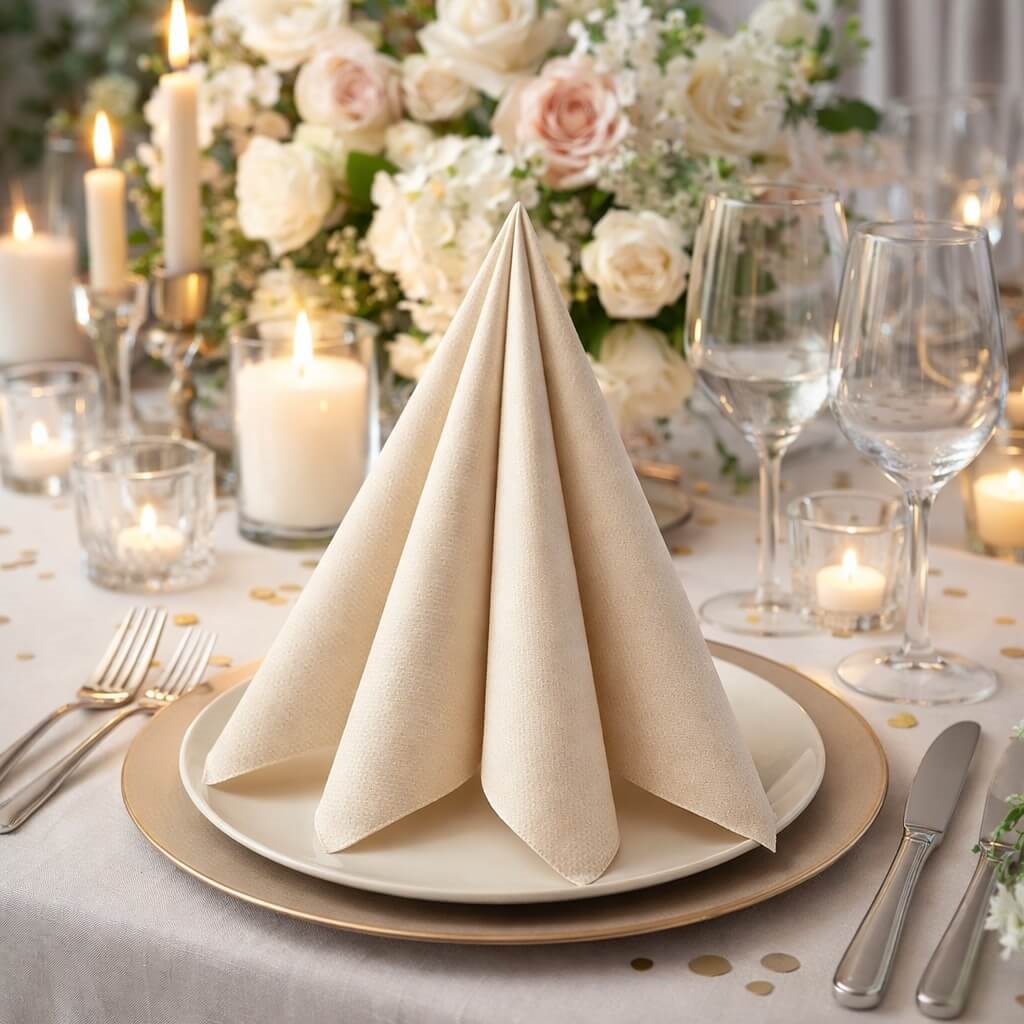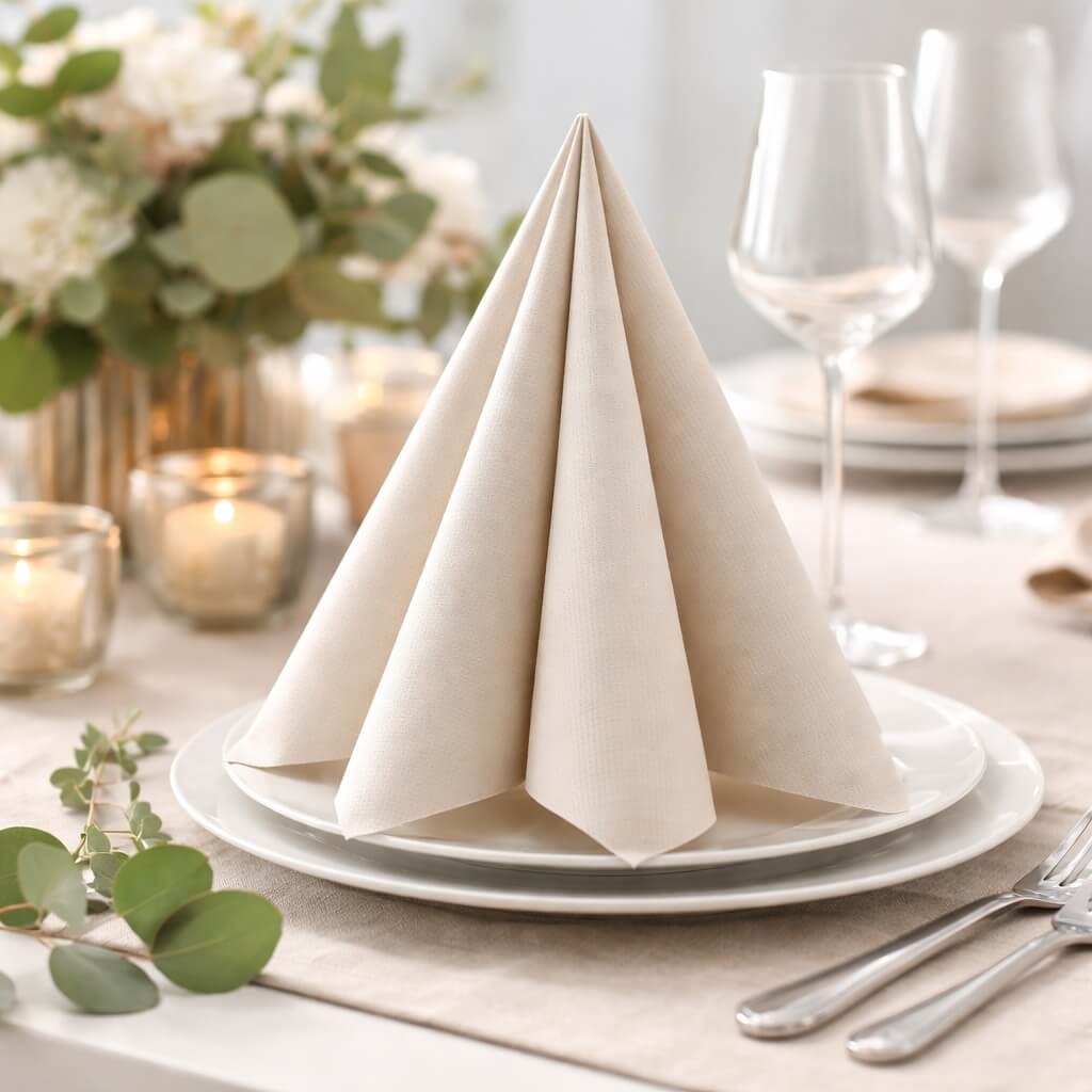 Med størrelsen 40×40 cm er servietterne ideelle til både klassisk og kreativ servietfoldning. Den neutrale beige farve gør dem alsidige og lette at kombinere med forskellige duge, tallerkener og borddekorationer – perfekt til både private fester og professionel brug.