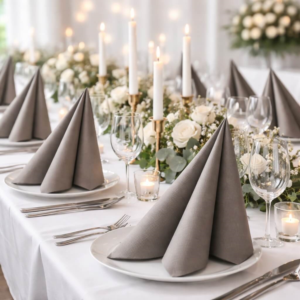 Gråbrun Sovie Linclass airlaid serviet foldet dekorativt i pyramideform 40x40 cmElegant festbord dækket med gråbrun Sovie Linclass airlaid serviet foldet dekorativt på hvid tallerkenPyntet festlokale med runde borde dækket med gråbrune Sovie Linclass airlaid servietter og blomsterdekorationerElegant festbord med gråbrune Sovie Linclass airlaid servietter foldet på hvide tallerkener og blomsterdekorationer