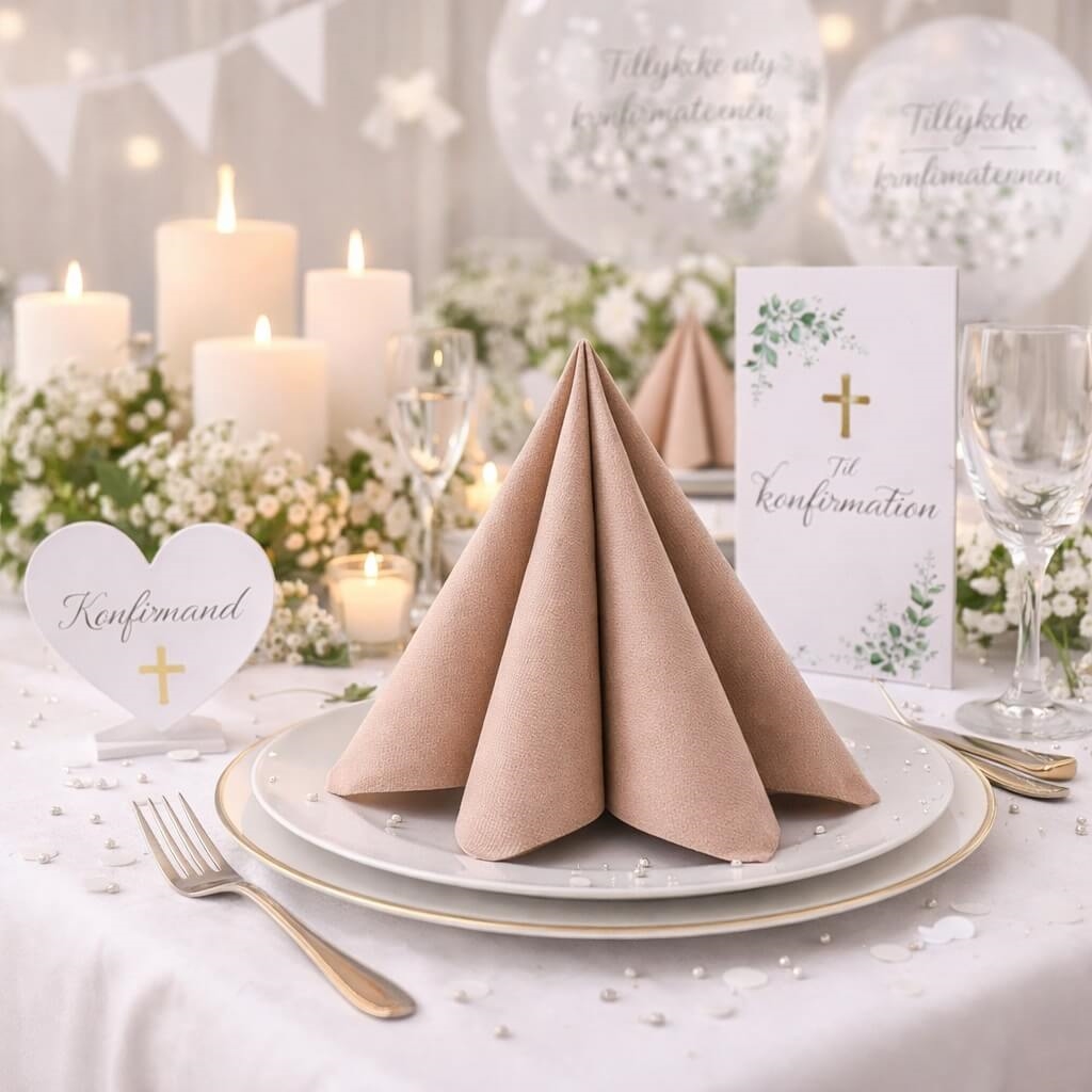 Sovie Linclass Airlaid serviet i rosegold foldet dekorativt, 40x40 cm.Rosegold Airlaid servietter foldet elegant på luksuriøst festbord med blomster, lys og guldbestik.Rosegold Airlaid servietter foldet dekorativt på elegant festbord med blomster, stearinlys og guldbestik.Rosegold Airlaid serviet foldet elegant på konfirmationsbord med hvide tallerkener, blomster og stearinlys.