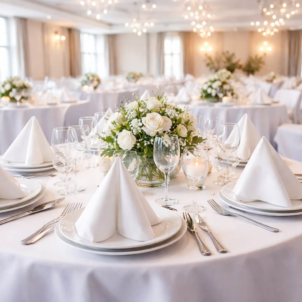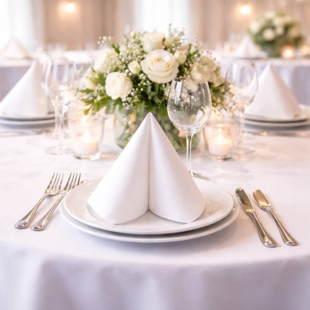 Elegant festbord dækket med hvide Sovie tissue servietter, foldet serviet på tallerken, glas, bestik og blomsterdekorationElegant festbord dækket med hvide Sovie tissue servietter, foldede servietter på tallerkener, glas, bestik og blomsterdekorationFoldet hvid Sovie tissue serviet på tallerken ved elegant festbord med glas, bestik og blomsterdekoration
