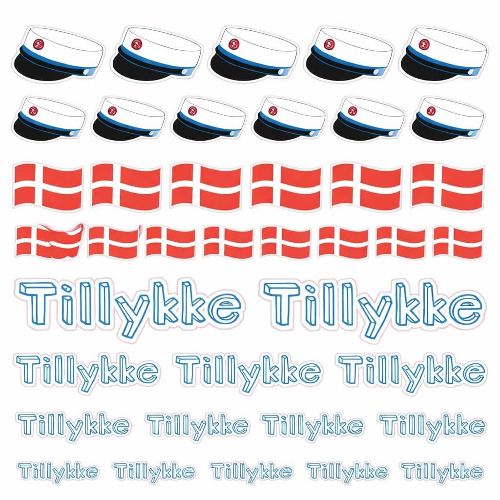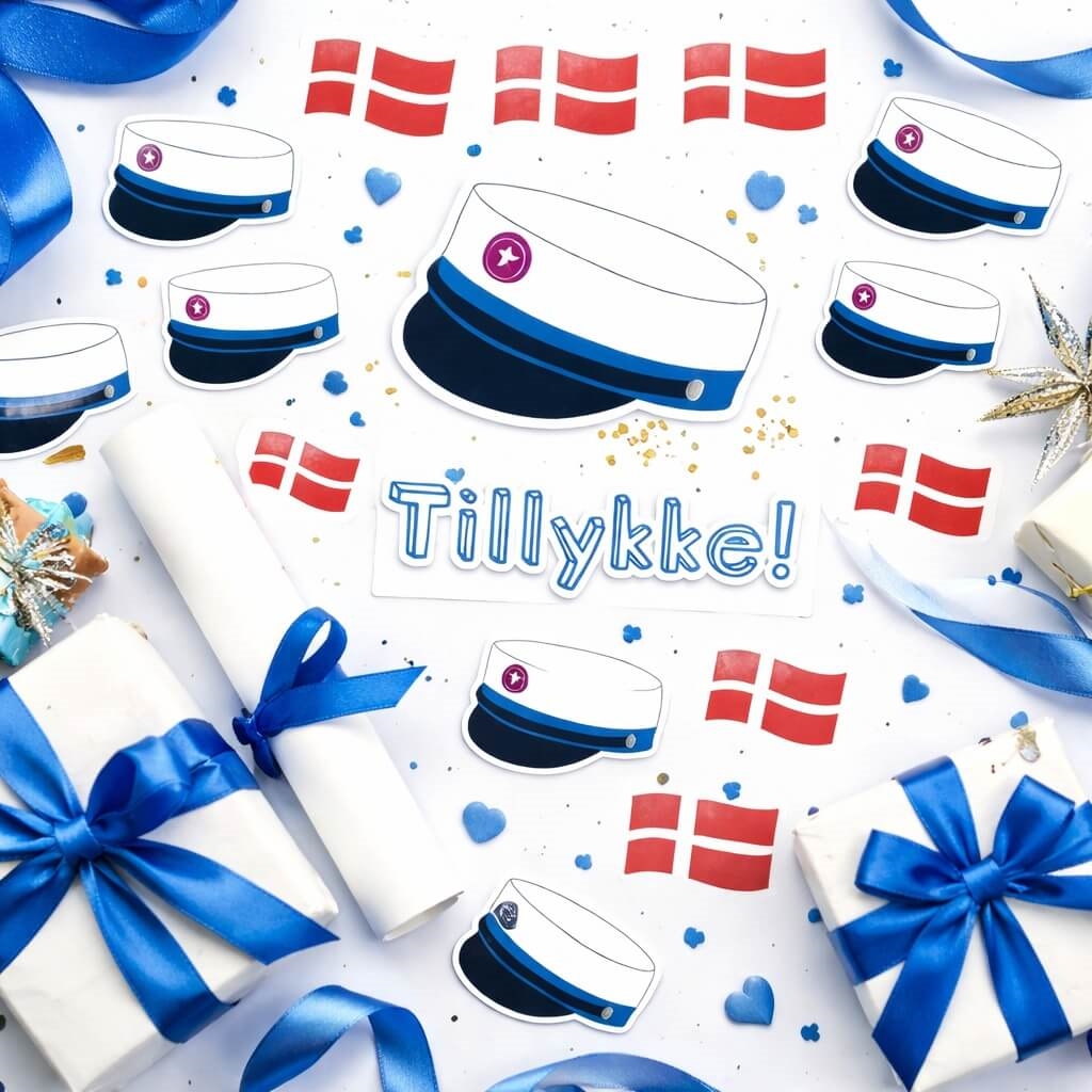 Blå student klistermærker med studenterhuer, danske flag og teksten Tillykke til studenterfestStemningsbillede med Stickers Student Blå brugt på gaver, kort og pynt til studenterfest med blå studenterhuer, danske flag og teksten TillykkeStemningsbillede af Stickers Student Blå brugt på gave, kort og pynt til studenterfest med blå studenterhuer og danske flag