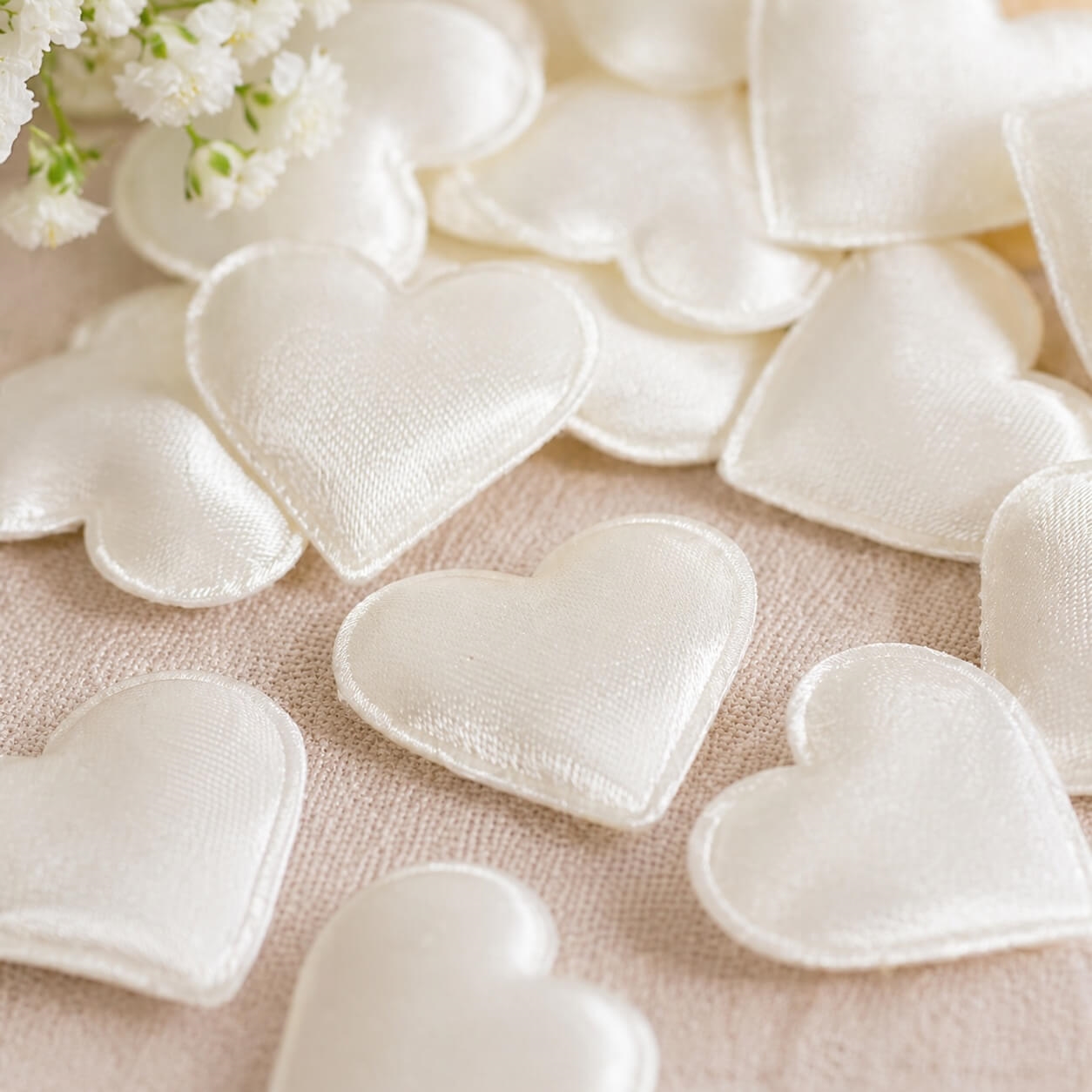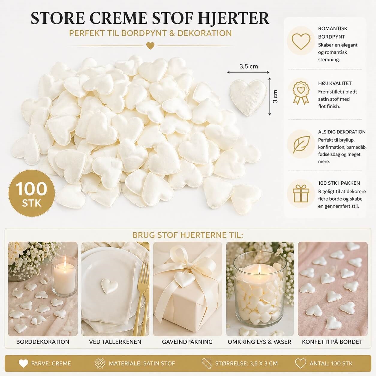 Skab en elegant og romantisk stemning med disse store creme stofhjerter i størrelse 3,5x3 cm. De smukke stofhjerter er perfekte som bordpynt til bryllup, konfirmation, barnedåb, valentinsdag og andre festlige begivenheder, hvor detaljerne gør forskellen.