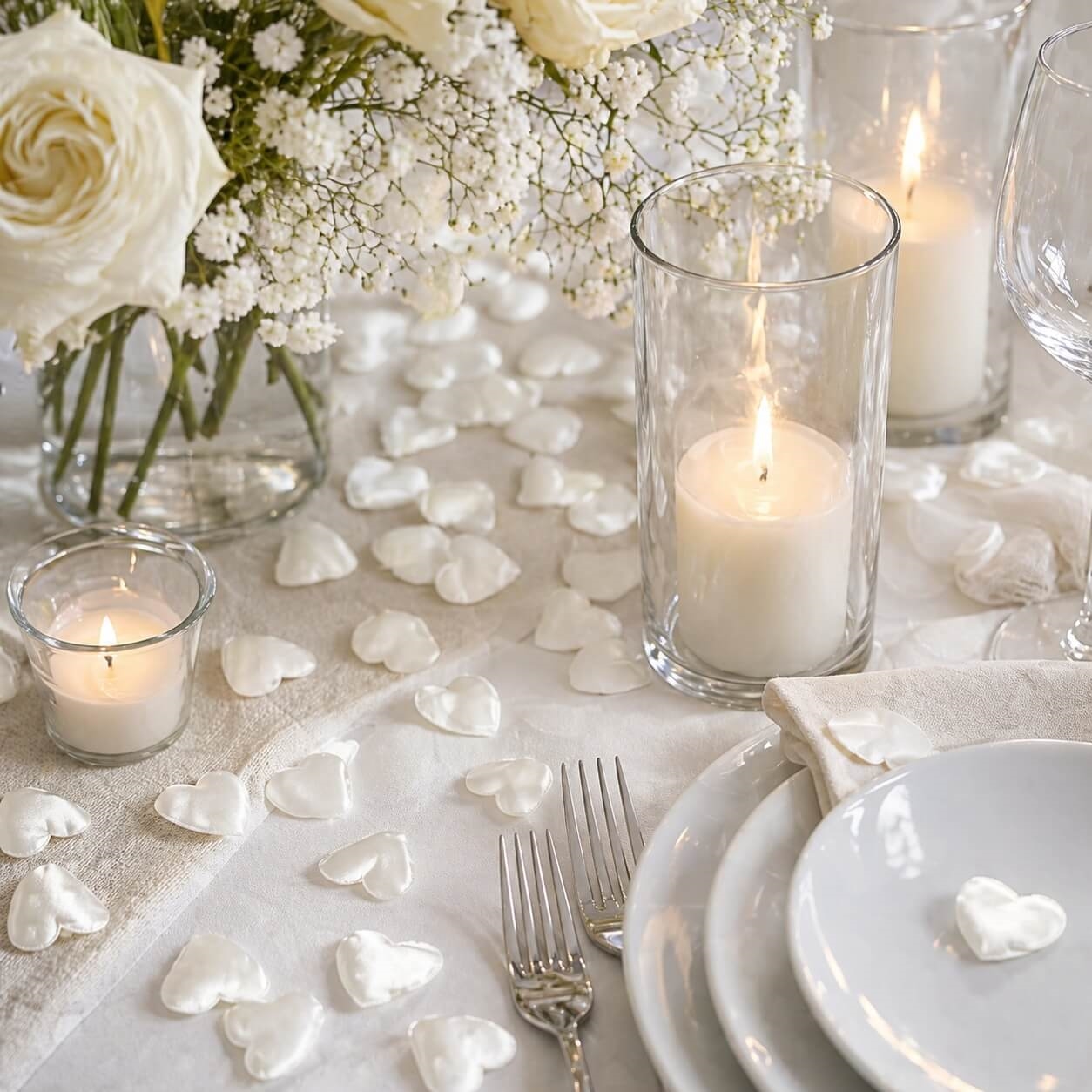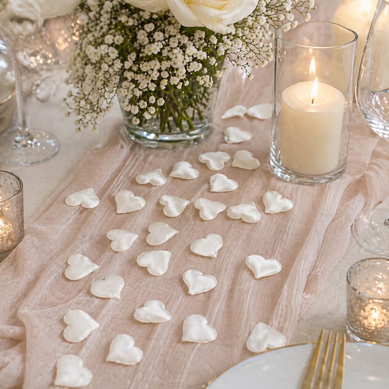 Hvis du ønsker en mere luksuriøs borddekoration, er stofhjerter et perfekt alternativ til traditionel papirkonfetti. Stoffet giver et blødere og mere eksklusivt look, som passer perfekt til romantiske og stilfulde arrangementer.