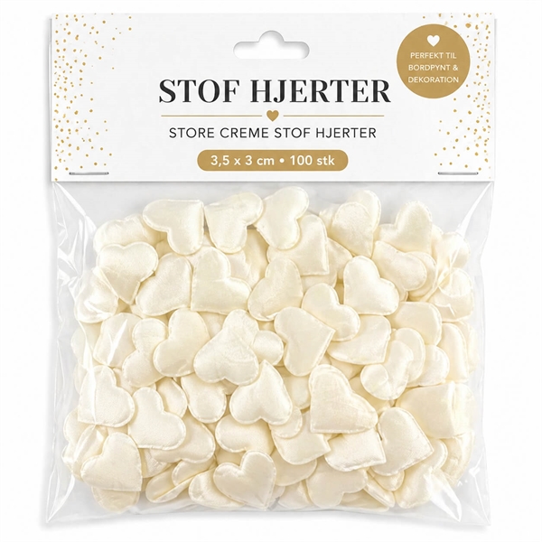Der er 100 stk. creme stofhjerter i posen.