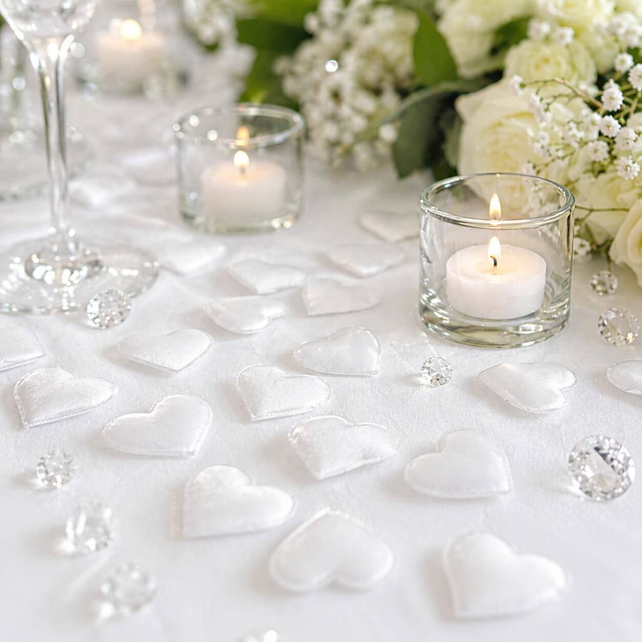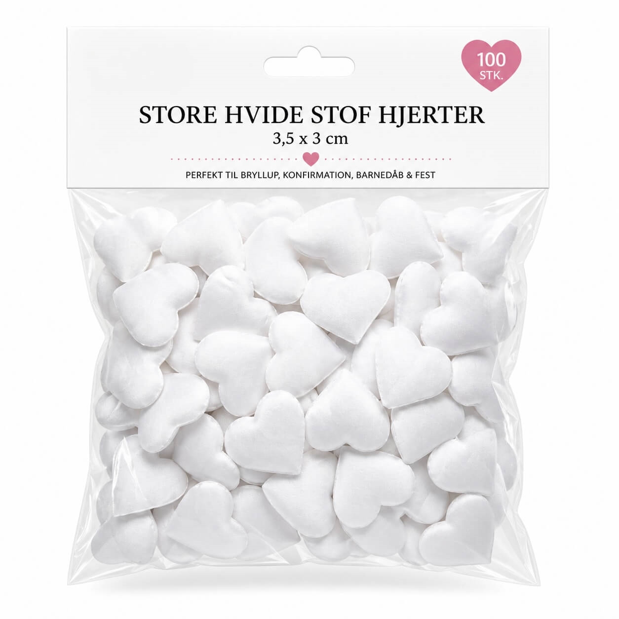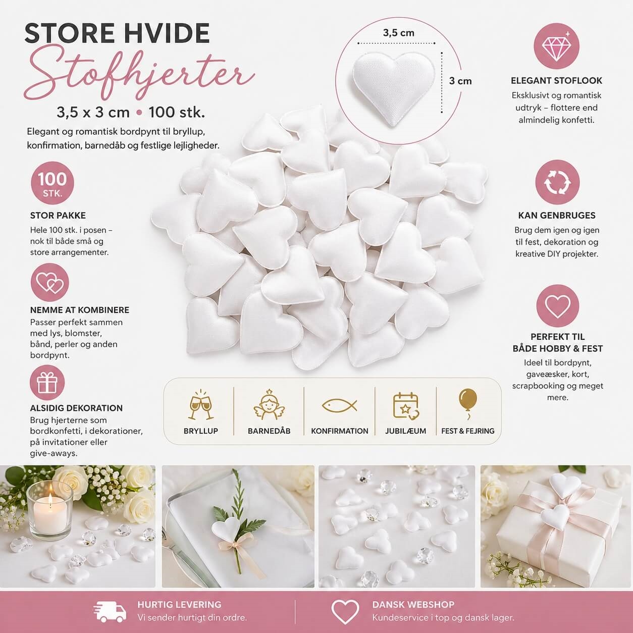 Skab en elegant og romantisk stemning med disse store hvide stofhjerter i størrelse 3,5x3 cm. De smukke stofhjerter er perfekte som bordpynt til bryllup, konfirmation, barnedåb, valentinsdag og andre festlige begivenheder, hvor detaljerne gør forskellen.