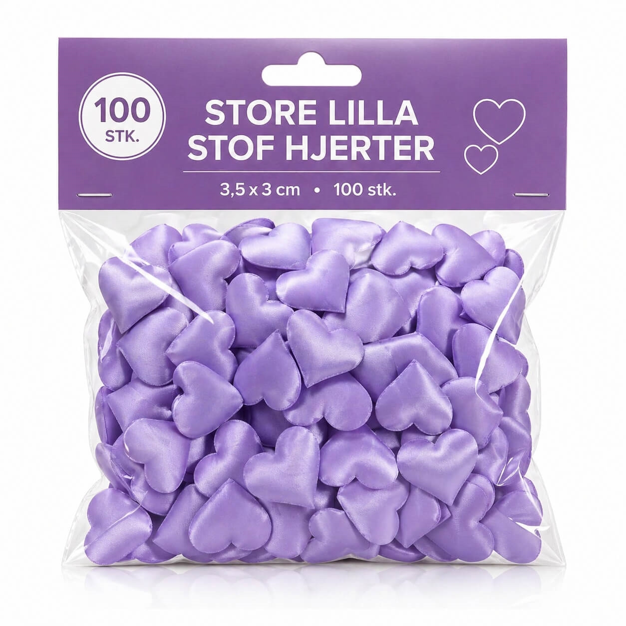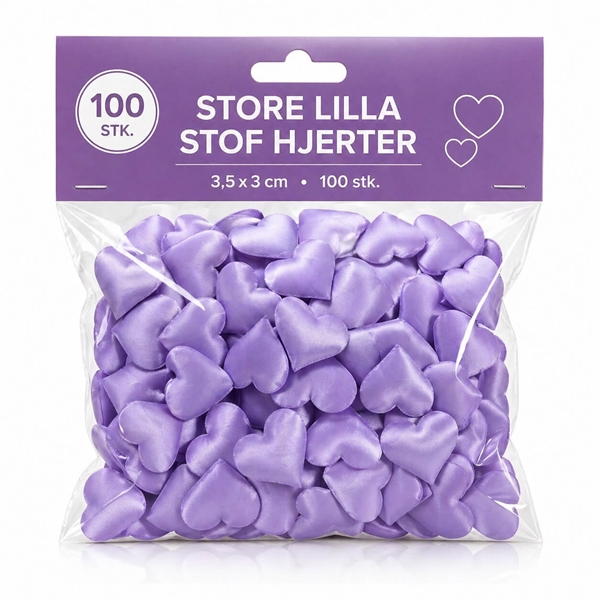 Der er 100 stk. lilla stofhjerter i posen.