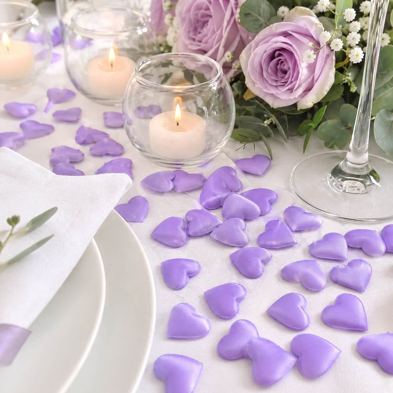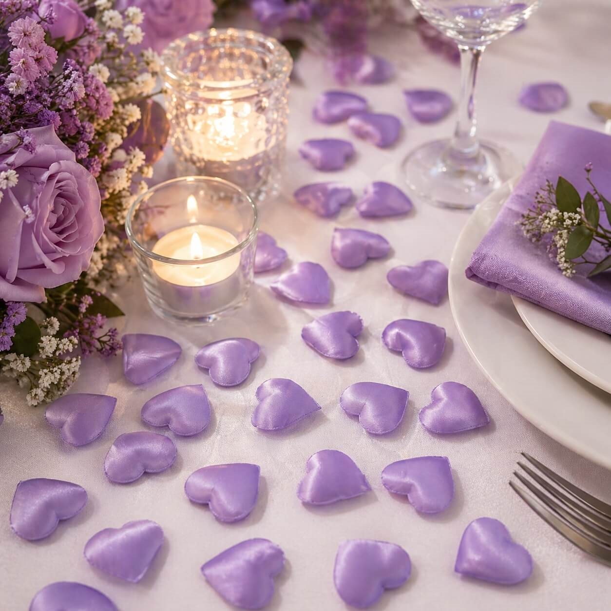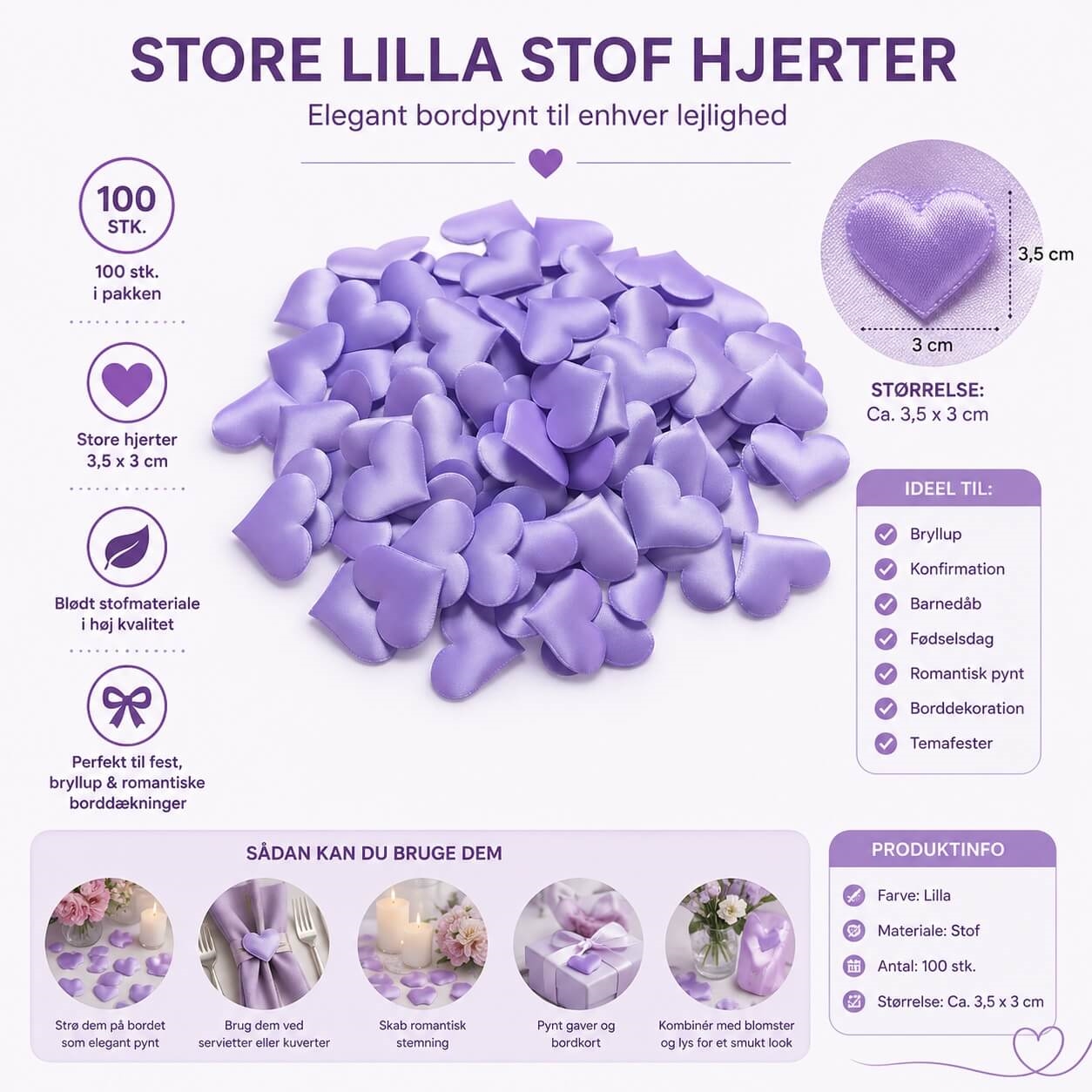 Skab en elegant og romantisk stemning med disse store lilla stofhjerter i størrelse 3,5x3 cm. De smukke stofhjerter er perfekte som bordpynt til bryllup, konfirmation, barnedåb, valentinsdag og andre festlige begivenheder, hvor detaljerne gør forskellen.