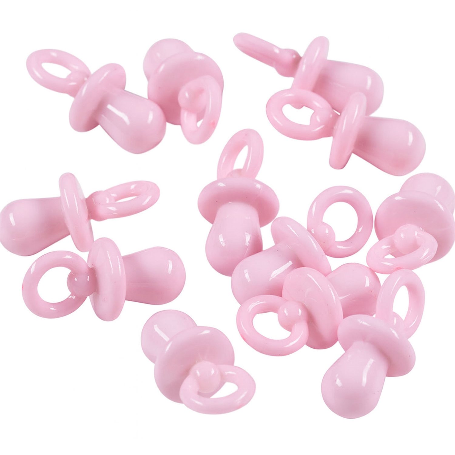 Søde små sutter i lyserød til pynt, når der skal være barnedåb og babyshower. Bind en lille sløjfe på og brug dem på bordkort, ved servietten, som pynt på grene i en vase.