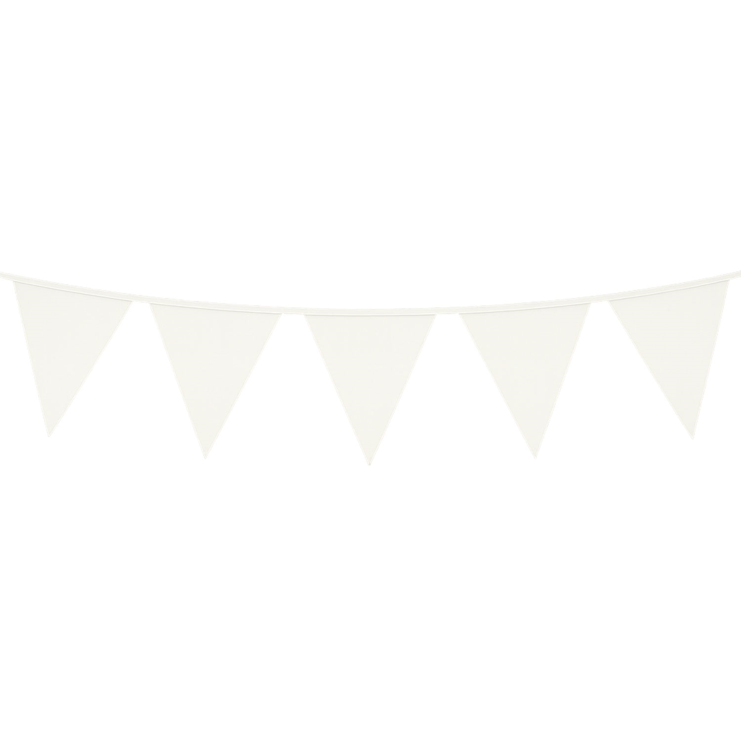 Vimplerne er lavet af hvid plastik, og guirlanden kan derfor bruges udendørs. Den er også mere robust end en guirlande af pap eller papir, så derfor kan du bruge den igen og igen. Måske skal den være fast inventar ved den årlige sommerfest. Sæt den sammen med en lyskæde for en ekstra flot effekt.